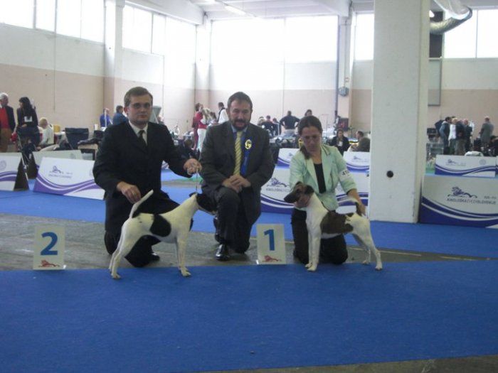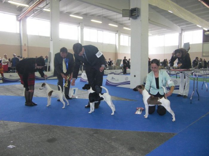 Organizátoři bohužel rozdělili posuzování foxteriérů do dvou kruhů. Na tom bych neshledával nic špatného, kdyby nebyly umístěny také ve dvou halách. Po celou dobu jsem se pohyboval v prostoru hladkosrstých, takže o dění v další hale nemohu být příliš sdílný. Foxteriéry posuzovali manželé Delmarovi z Irska (hladkosrsté Sean a drsnosrsté Cathy). Tento manželský pár posuzoval již v roce 2008 na naší Klubové výstavě, takže nám nebyli nijak neznámí. Foxteriérů hladkosrstých bylo přihlášeno překvapivě málo – 34. To nejlepší představily chovy z Maďarska (Agria, Mercuryfox a Foxi-Maxi), Itálie (Starpride), Dánska (Foxingdane), z daleké Ukrajiny (From Alexandrov’s House) nebo Finska (Rennam, Texforrier). Zvlášť velkou pozornost poutala přítomnost Texforrier Marimekko – vítězky plemene na letošní světové výstavě.