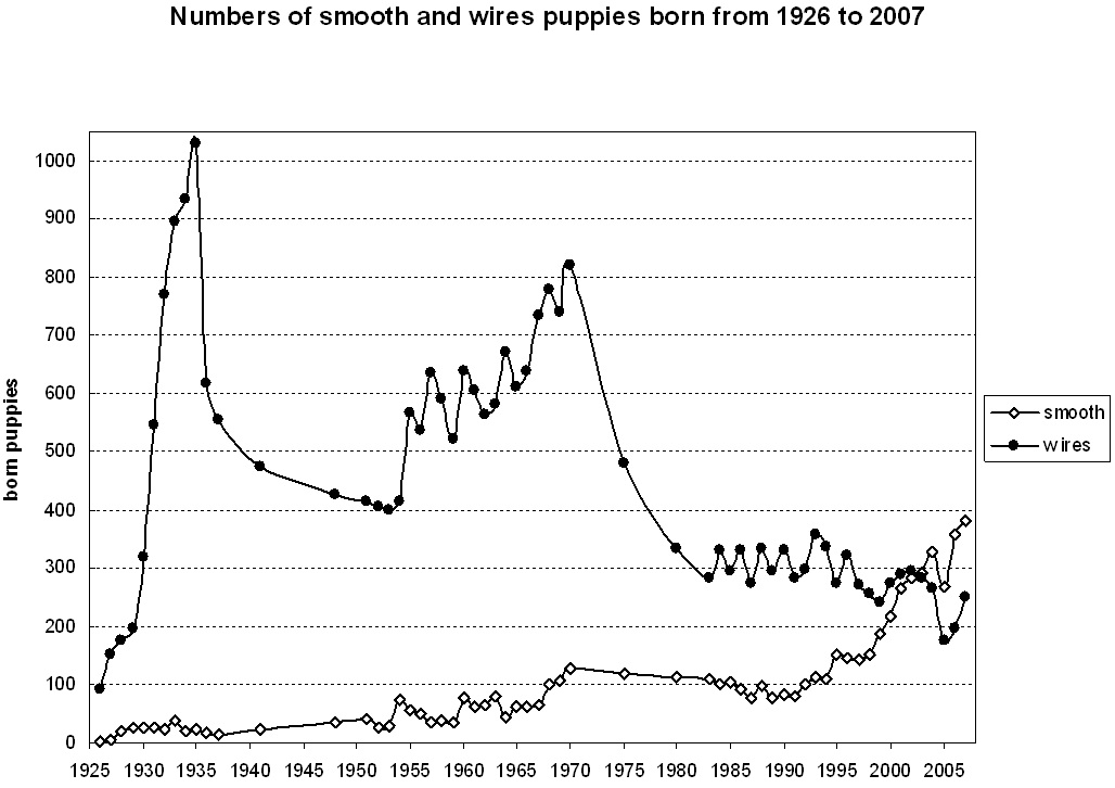 During the Seventies a co-operation with the well known v. d. Bismarckquelle kennel from Germany began. Especially influential were the Smooth dogs Piet and Vino v.d. Bismarckquelle which were strongly based on Newmaidley lines and the Wire dog Zerus v.d. Bismarckquelle.During the early seventies there were over 800 Wires and 130 Smooths registered. In 1980 breeder/owner Frantisek Sveda gained the European title winner with Darina ze Silfova dolu.
